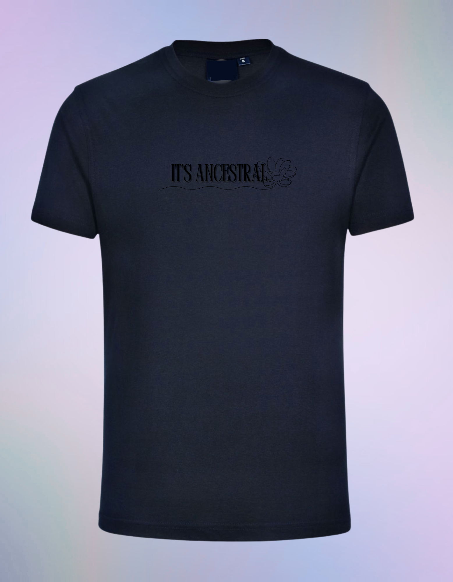 - Minimal chest print: “It’s Ancestral” with lotus detailing